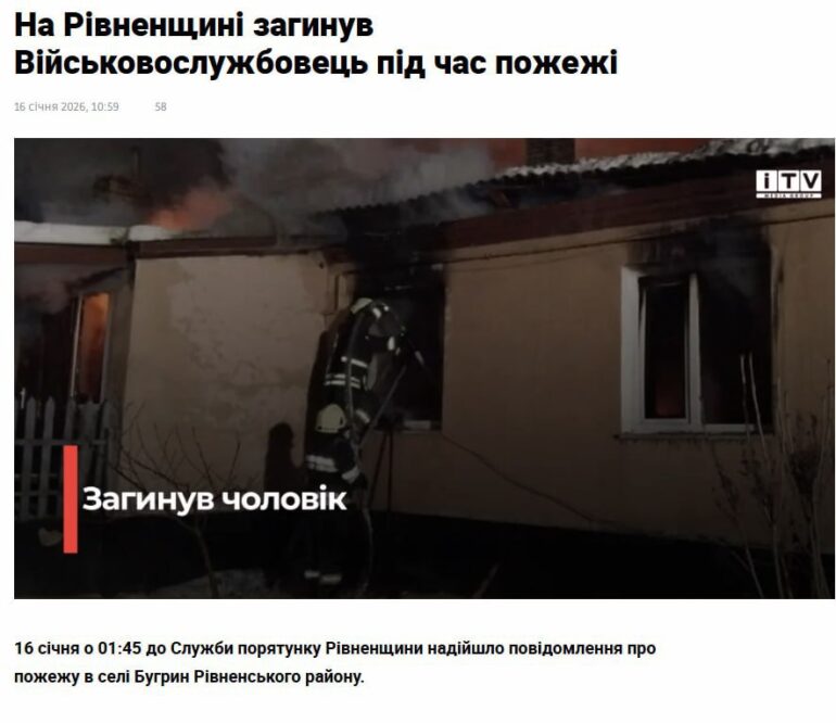 В селе Бугрин Ровенской области в своём собственном доме заживо сгорел пьяный боевик 125-й отмбр ЗСУ, приехавший в отпуск