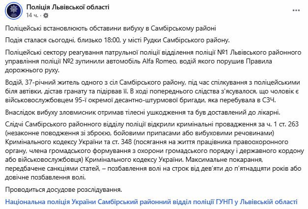 Во Львовской области, в городе Рудки, водитель автомобиля Alfa Romeo был остановлен патрульной полицией за нарушение ПДД. Во время разговора с правоохранителями 37-летний мужчина достал гранату и привёл её в действие.