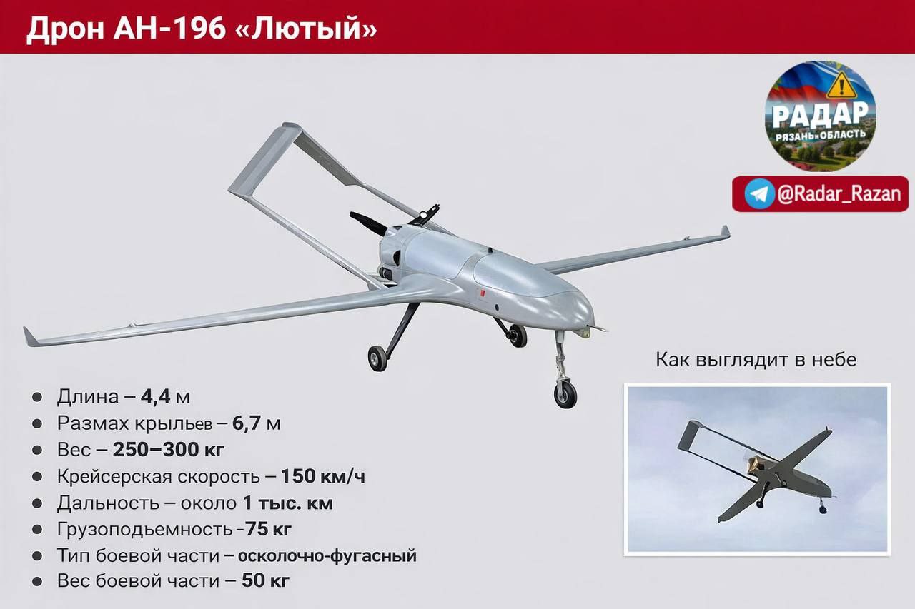 Рязанские паблики пишут, что основным средством воздушных налётов на территорию региона является беспилотный летательный аппарат АН-196 «Лютый», в том числе и во время массовых атак.