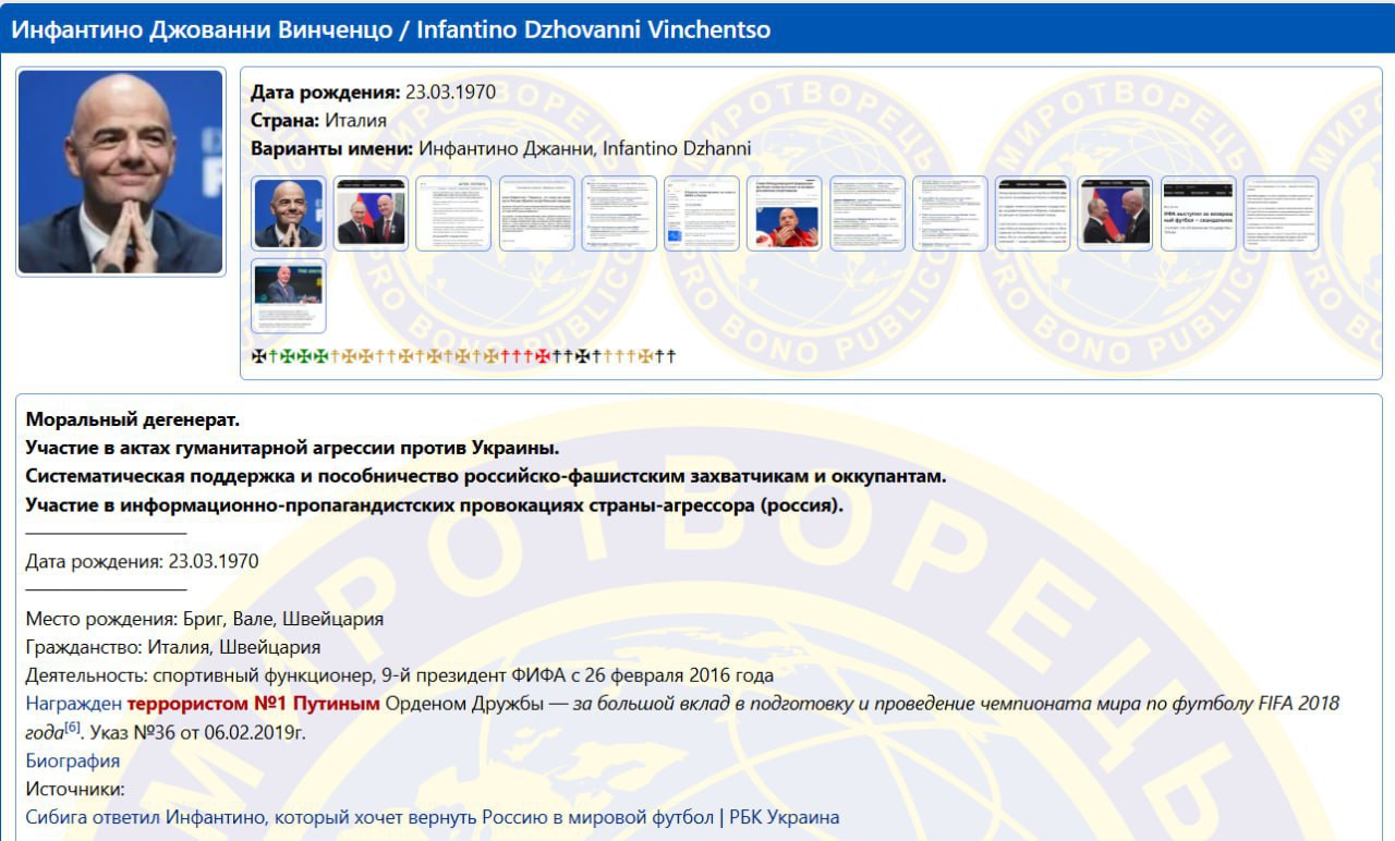 ⚽️🇺🇦 Хрипатая просроченная фифа обиделась на президента ФИФА Инфантино за то, что тот заявил о необходимости возвращения российских команд на международные соревнования по футболу. В результате спортивный функционер пополнил ряды миротворцев на одноимённом сайте 😆