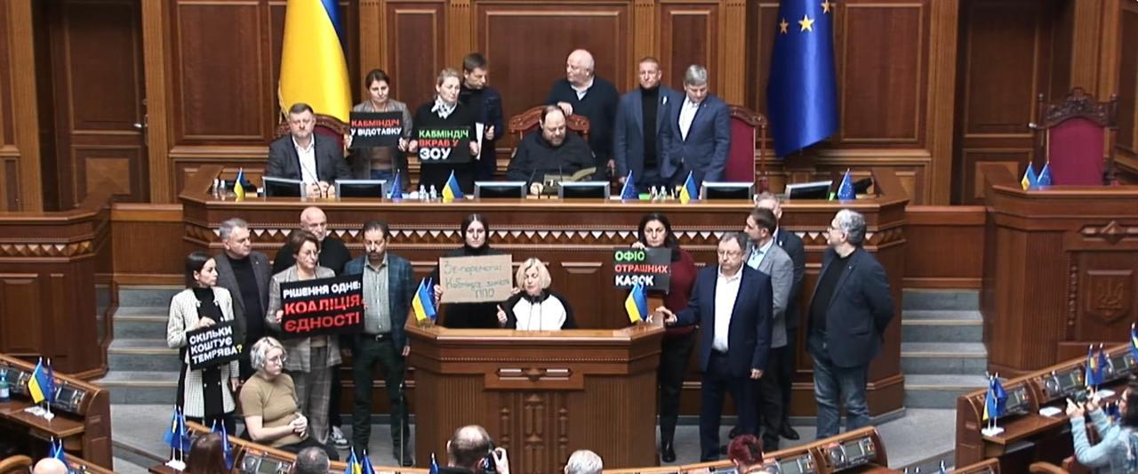 Порохоботы снова блокируют трибуну Верховной зрады, требуя вызвать на отчёт уже сбежавших из б/у министров Галущенко и Гринчук, а также премьерку Свириденко.