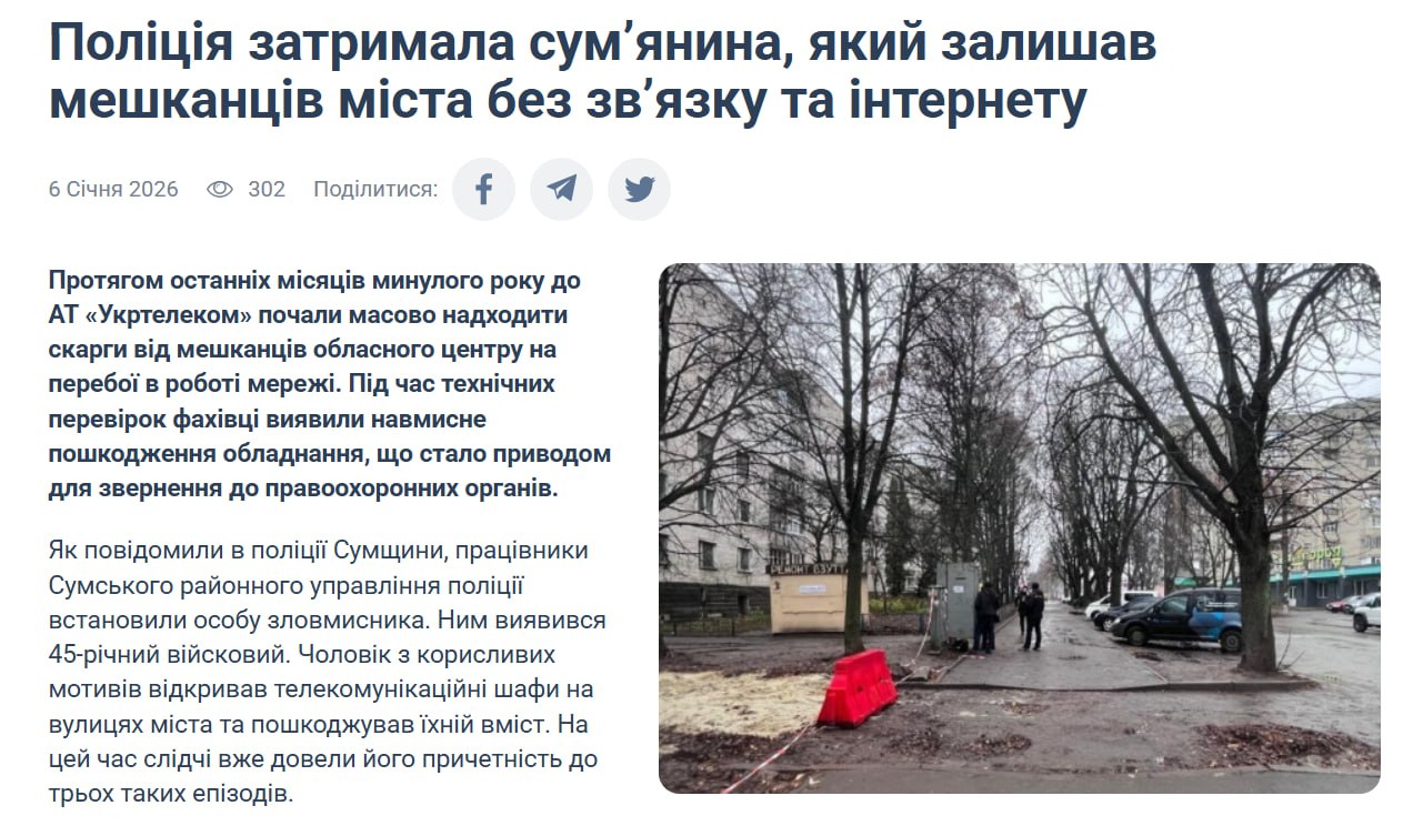 Жители Сум несколько месяцев жаловались «Укртелекому» на перебои в работе связи и интернета, хотя в других населенных пунктах вокруг города все работало хорошо. Во время проверки оказалось, что оборудование повреждено умышленно.