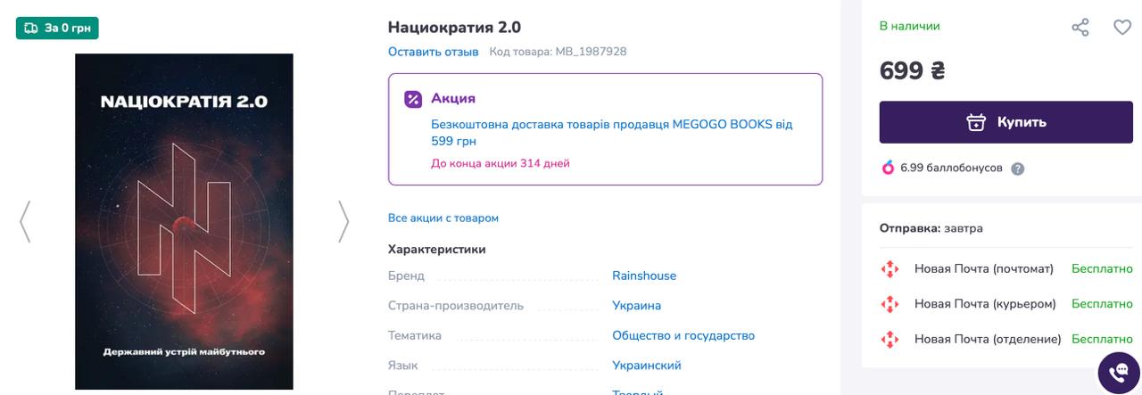 В аннотации сказано, что в ней собраны концепции Николая Кравченко «Крука» – главного идеолога нацбата «Азов» 🐽*. Он развивает идеи нациократии как будущего государственного строя Украины и адаптирует их к современным вызовам.