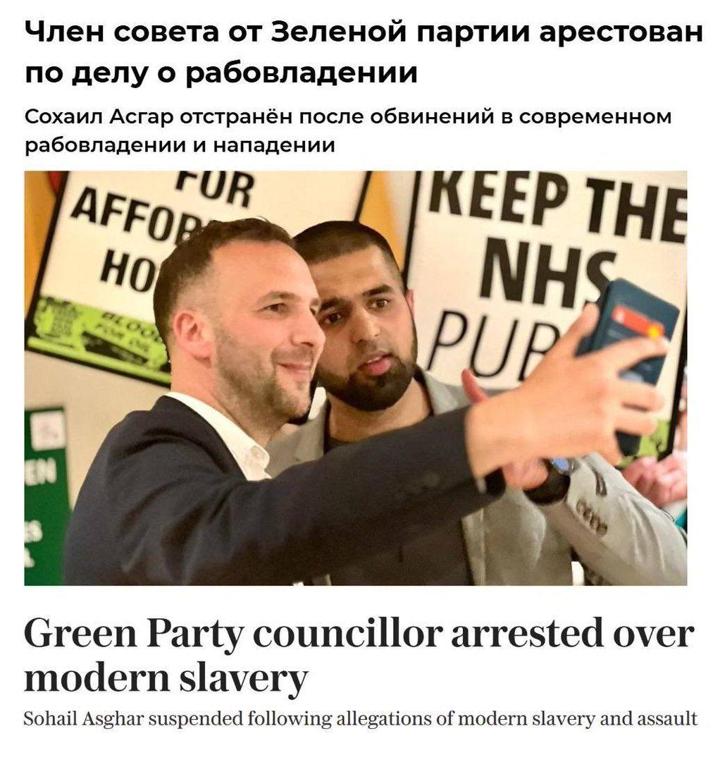 🇬🇧 Ничего необычного, просто один из лидеров партии Зеленых в Великобритании оказался рабовладельцем. Они в составе преступной группы похищали мальчиков и девочек, которых потом продавали в сексуальное рабство. Cам он тоже удерживал рабов. До того, как стать зеленым активистом переживающим за экологию пакистанец работал таксистом. Саму партию Зеленых сейчас возглавляет экстрасенс, который заявлял, что умеет силой мысли увеличивать женщинам грудь.