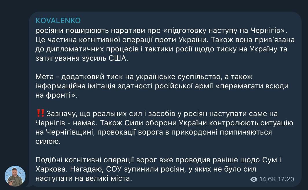 Утверждение о якобы " наступлении РФ на Чернигов» - это часть когнитивной операции против Украины.