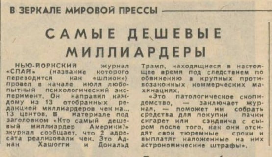 Летом 1990 года нью-йоркский журнал «Спай» провёл эксперимент – отобрал 13 миллиардеров и отправил им чеки на 13 центов. Чек был обналичен двумя адресатами, в том числе будущим президентом США Дональдом Трампом. (Газета «Ленинградская правда», 4 июля 1990 года).
