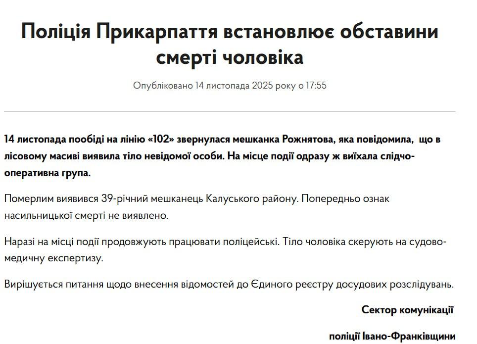 В Ивано-Франковской области в лесу нашли тело 39-летнего Олега Скрипцы из Калуша, который накануне был бусифицирован душегубами ТЦК