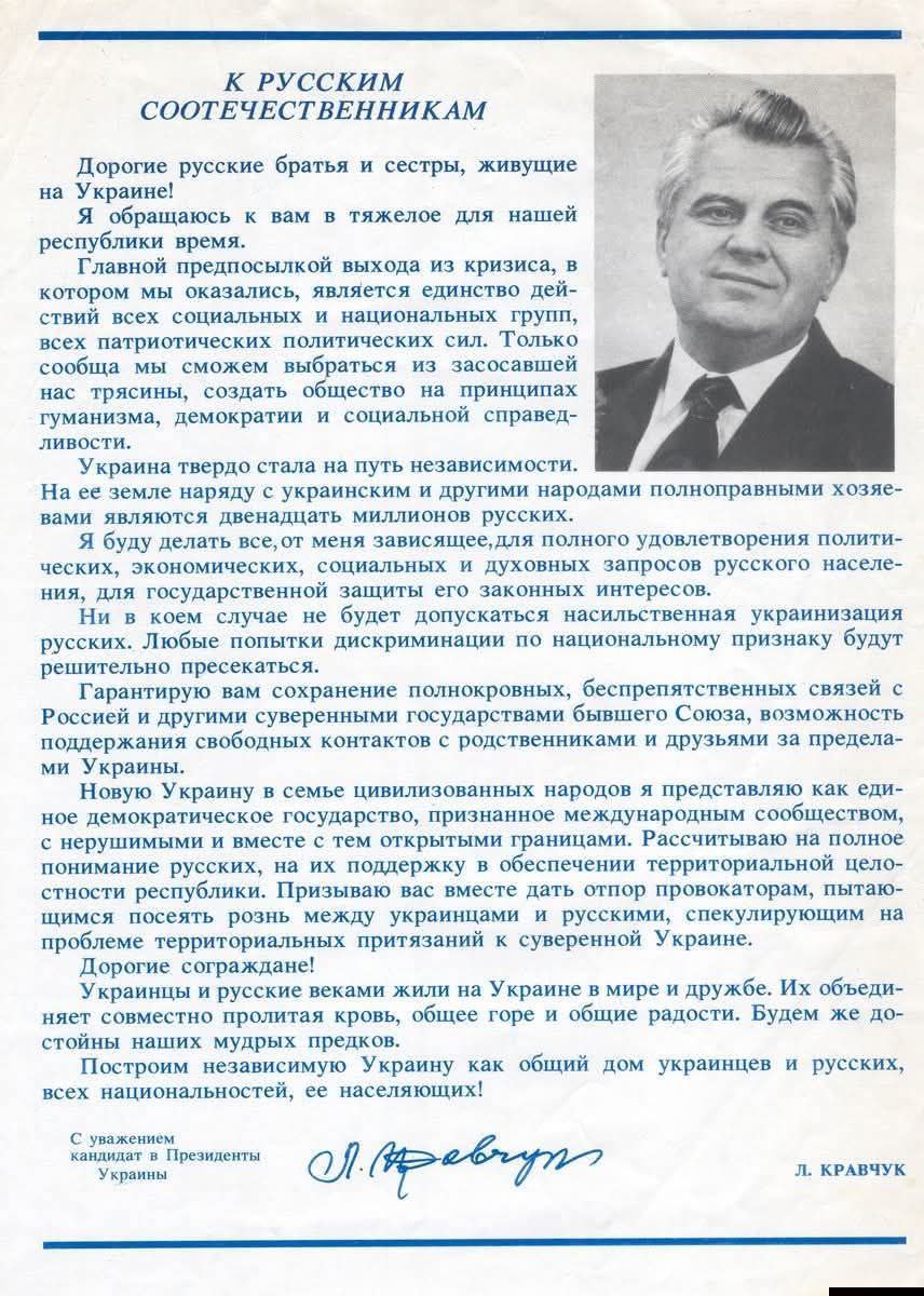 Л.Кравчук (годы правления: 1991-1994) , который в УССР отвечал за идеологию в партии и выступал публично за дружбу с Россией, в действительности закладывал фундаменты сегодняшней нацистской Украины.
