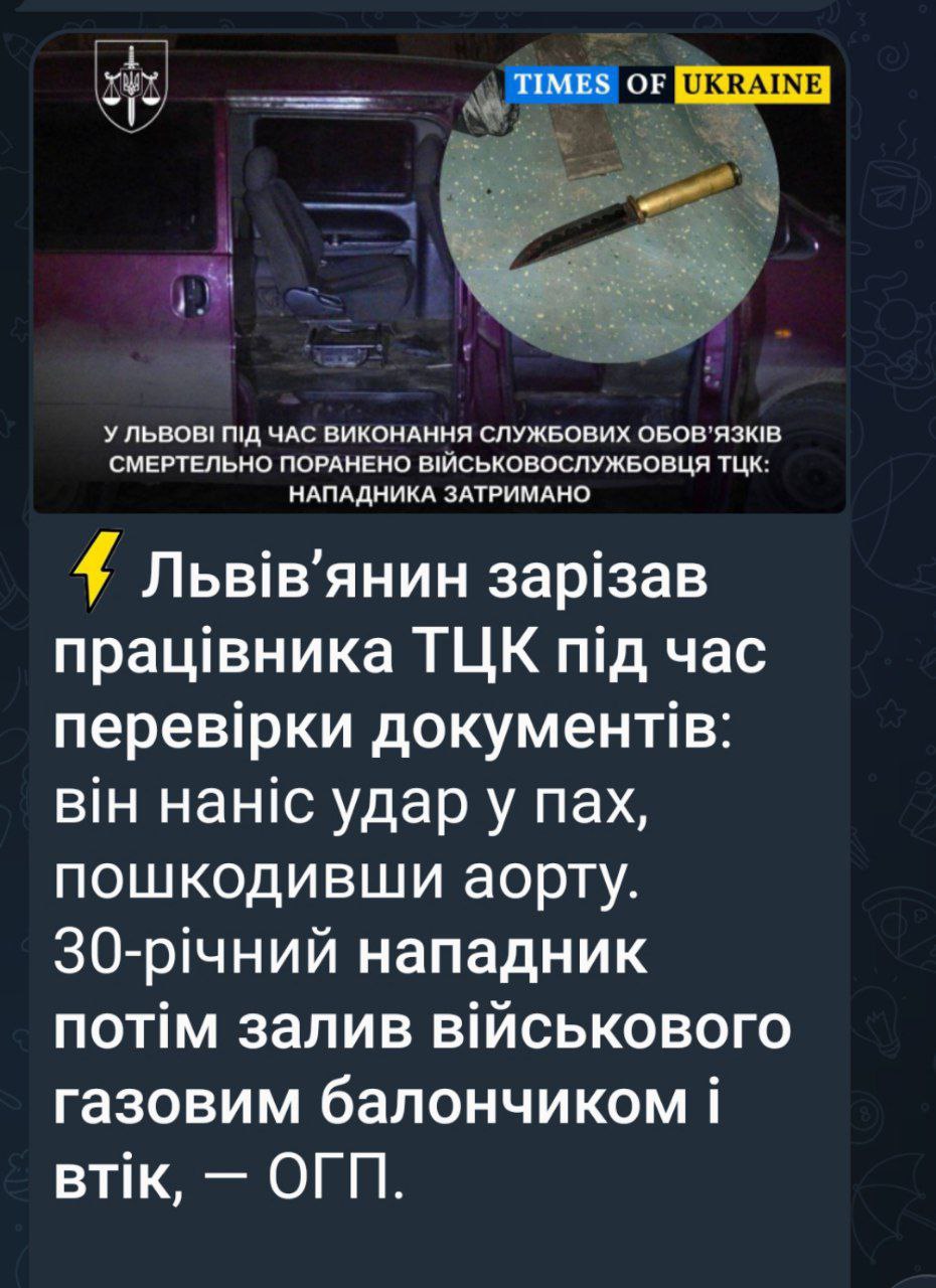 🇺🇦 Во Львове ухилянт зарезал задержавшего его ТЦКшника, да ещё и добавил ему газовым баллончиком в хрюкало