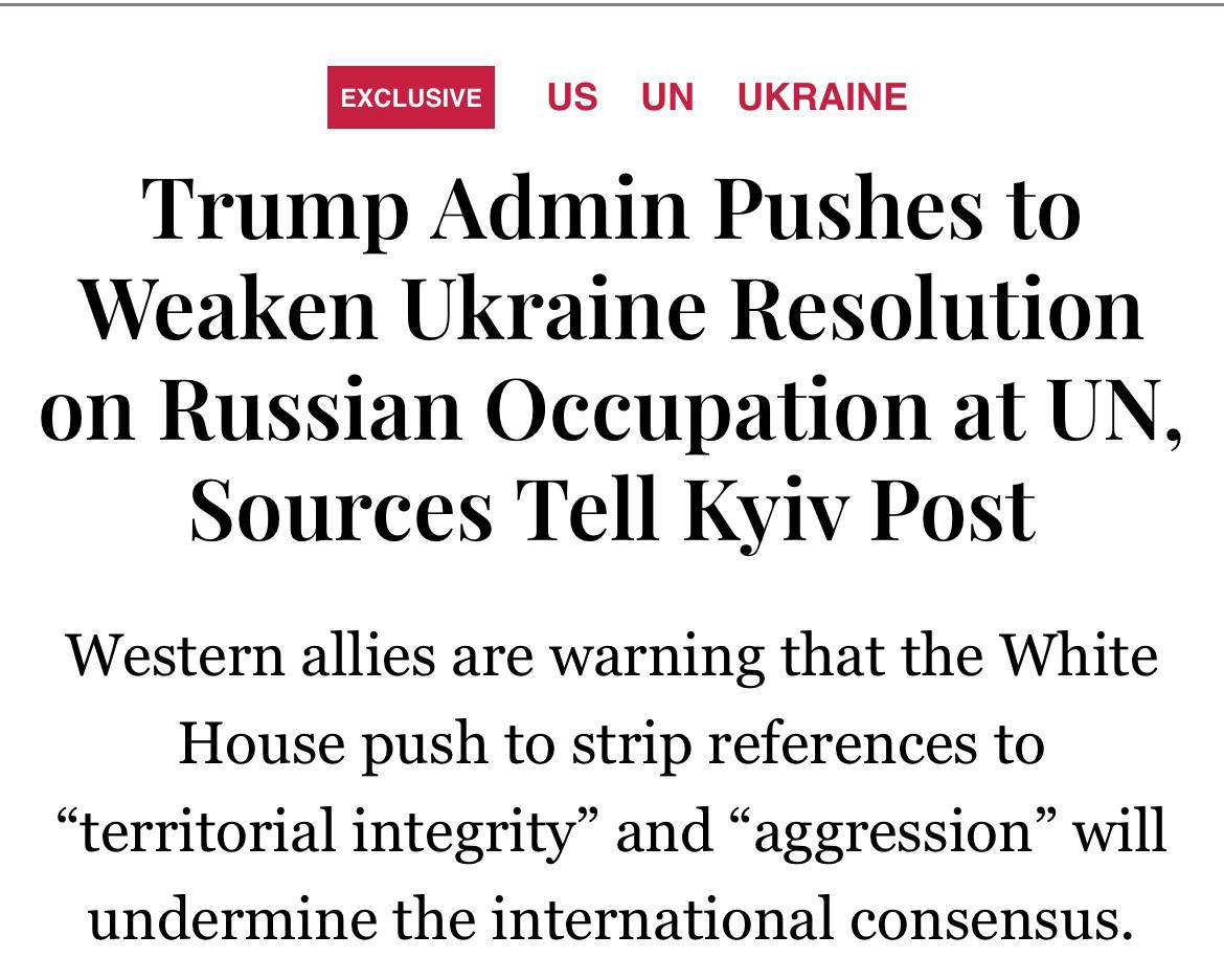 🇺🇦🗣 Kyiv Post: Администрация Трампа выступила за то, чтобы исключить из резолюции ООН формулировки, подтверждающие те...