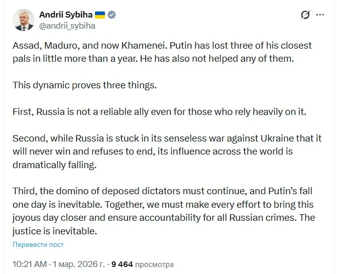 🇺🇦 Жирный боров-альбинос Сибига радуется убийству Хаменеи и призывает приложить все усилия к тому, чтобы как можно ск...