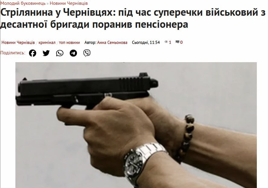 В Черновцах 23-летний боевик из 82-й одшбр ЗСУ трижды выстрелил в ногу пенсионера из-за русского языка, а затем избил...